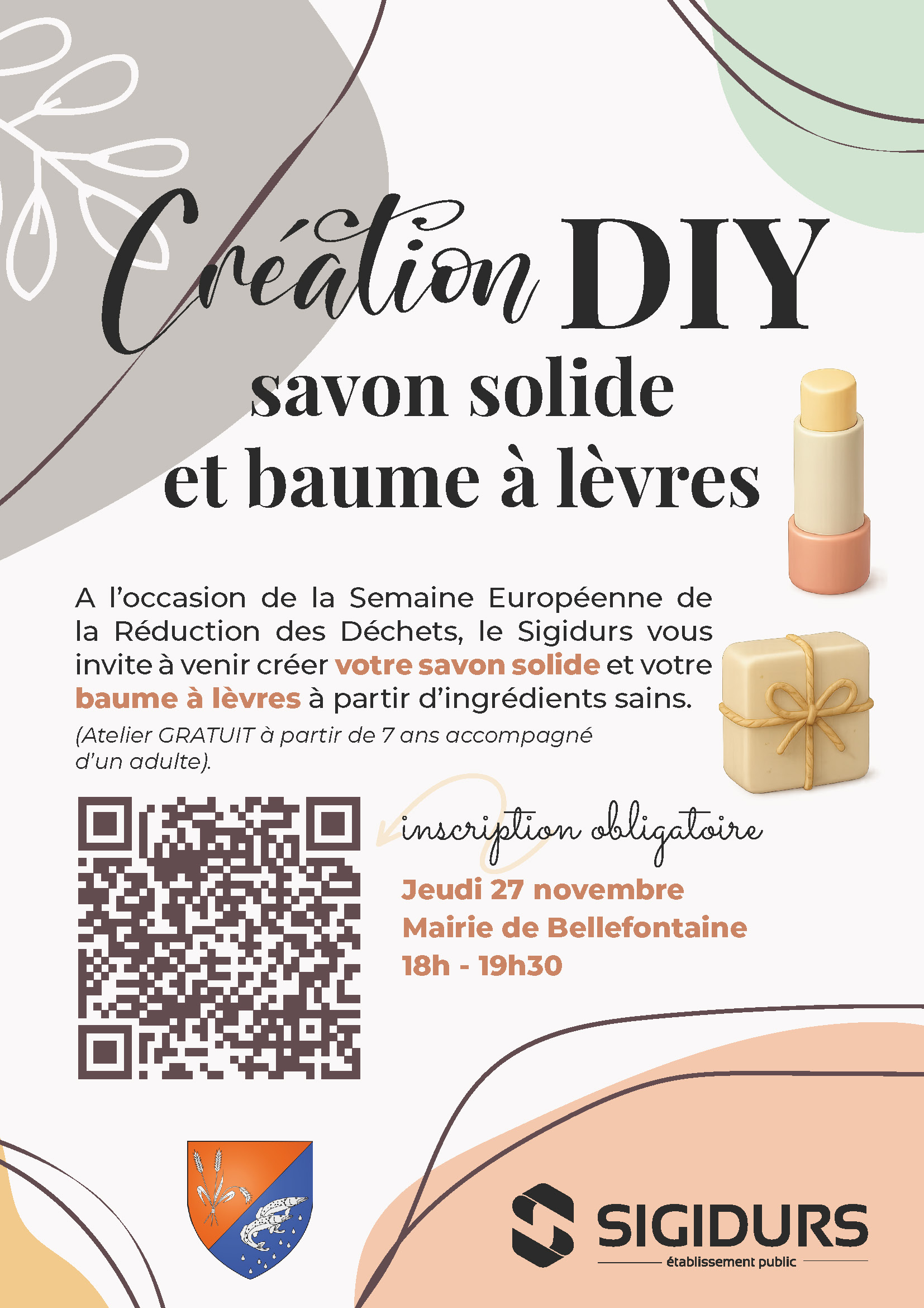 À l’occasion de la Semaine Européenne de la Réduction des Déchets, le Sigidurs vous invite, jeudi 27 novembre, de 18h à 19h30 à la mairie de Bellefontaine, à venir créer votre savon solide et votre baume à lèvres à partir d’ingrédients sains.