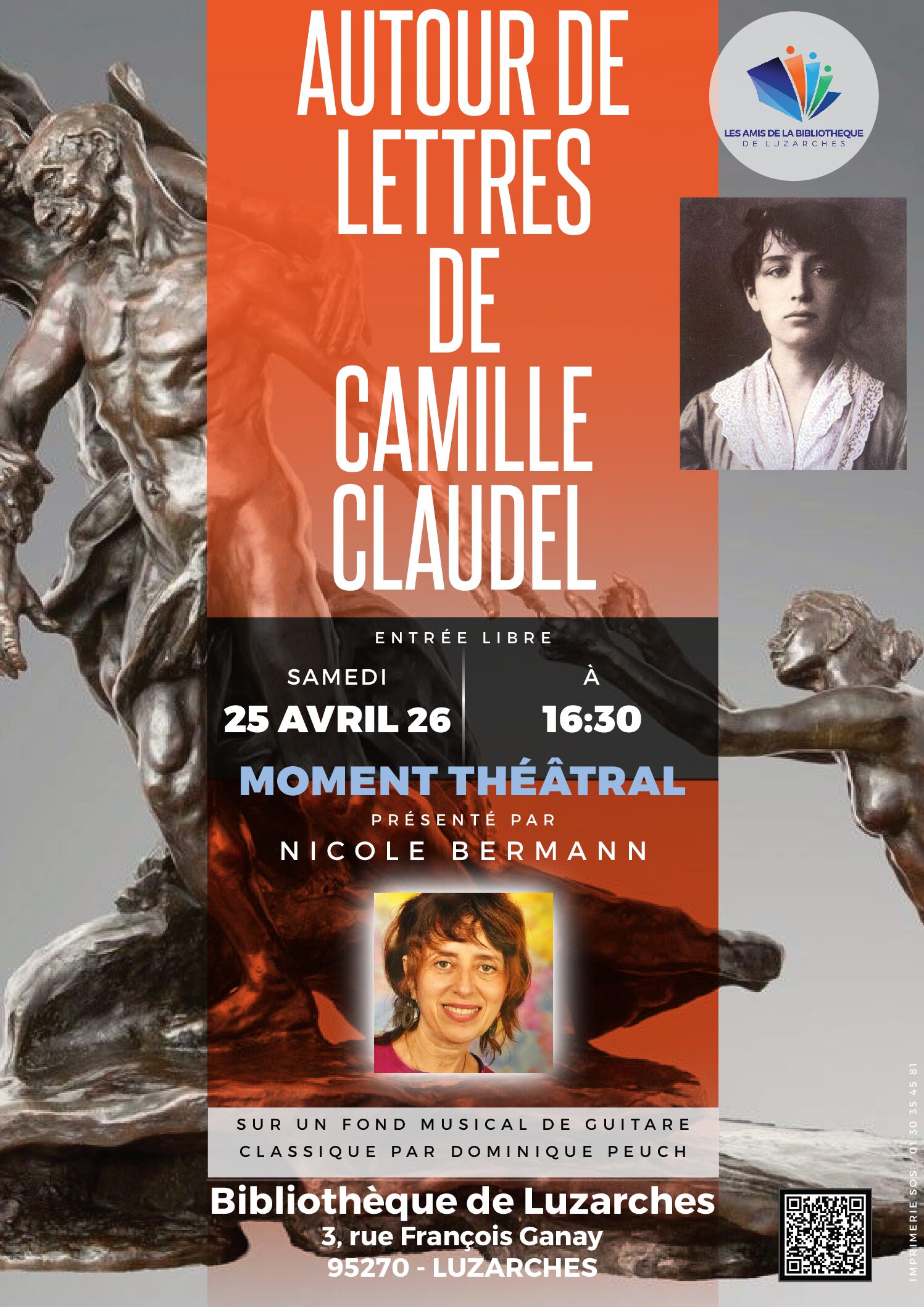 L’association Les Amis de la Bibliothèque a le plaisir de vous convier à un moment théâtral autour des lettres de Camille Claudel, le samedi 25 avril à 16h30 à la Bibliothèque de Luzarches.